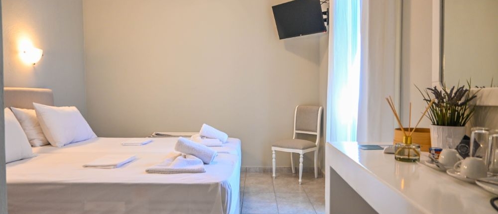 Το Τρίκλινο Δωμάτιο είναι η ιδανική επιλογή για οικογένειες ή γκρουπ. Αποτελείται από 1 king size κρεβάτι και 1 μονό κρεβάτι και ιδιωτικό μπάνιο και προσφέρει υπέροχη θέα στη θάλασσα. Η Σουίτα με Τρίκλινο Δωμάτιο διαθέτει σύγχρονες ανέσεις, όπως τηλεόραση, πετσέτες, παντόφλες, δωρεάν πρόσβαση Wi-Fi και δωρεάν προϊόντα περιποίησης.
